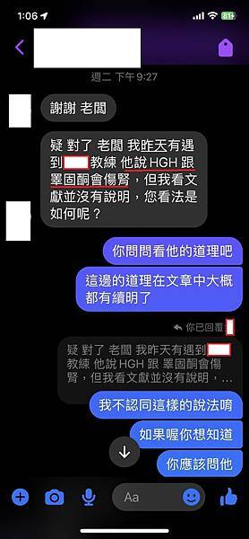 (七)小結一下,HGH、睪固酮並不會傷肝,但睪固酮的腎臟負擔,在合理使用下,例如醫療疾病用途,都尚可接受的,用PED對老鼠的身體健康都是有負擔的,如同對話圖中呈現的,拿你可以的負擔去換取預期效果,會比擔心一堆負擔,所以想先用負擔低的PED,殊不知CP值相比下來,副作用大一點的PED換來的效果與CP值,還比那些看似安全的PED來的顯著與高CP值。