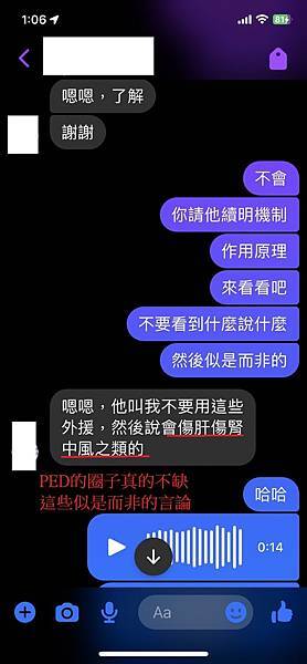 (四)用PED本身對身體都是會有負擔的,沒事不要用,想要用,卻又抱持著那這個對身體負擔很低,所以我想要用這個的心態,真不巧小白們這種心態,剛好就被商人逮到,使用話術、商業手法洗腦這些無知的小白,去達到了商人的目的。