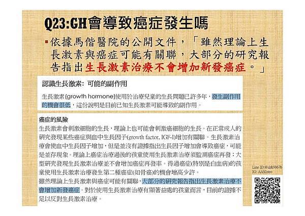 (二)有關致癌問題,馬偕醫院的公開資料已闡述,大多研究報告指出生長激素治療不會增加新發癌症。